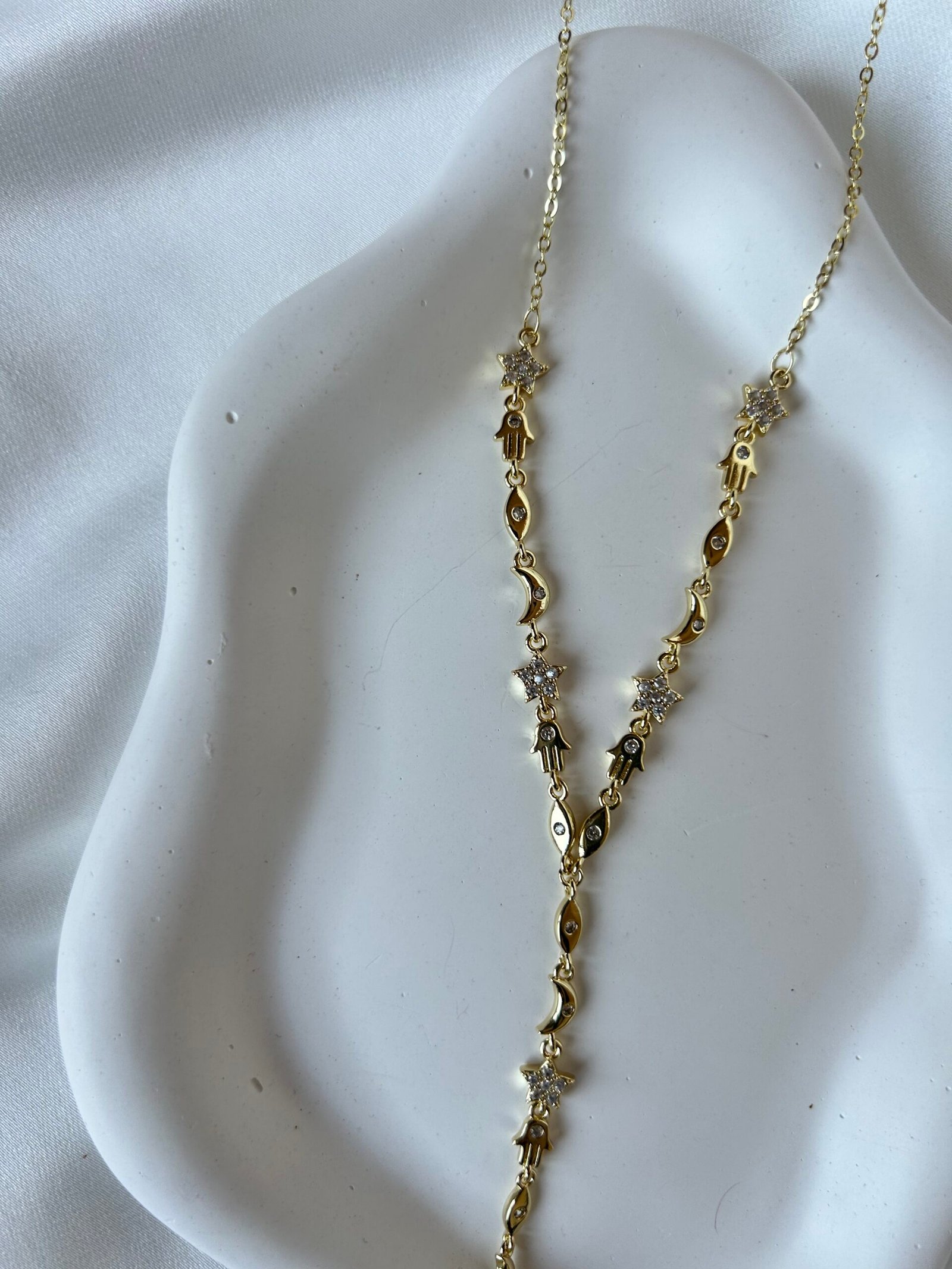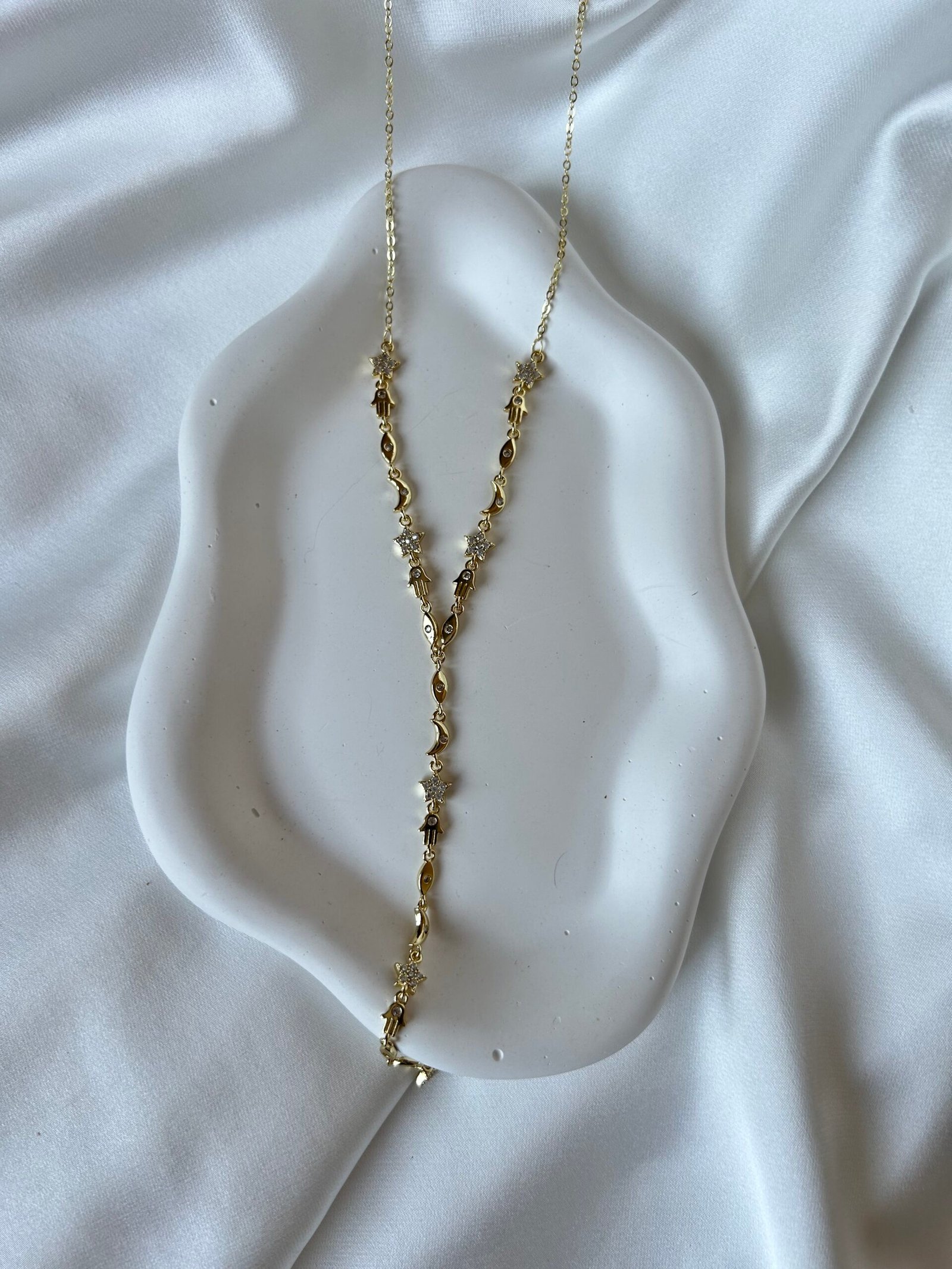 Minimal formu güçlü bir ifadeyle buluşturan Y formlu Manifest Kolye, boynun doğal hattını zarifçe vurgular.